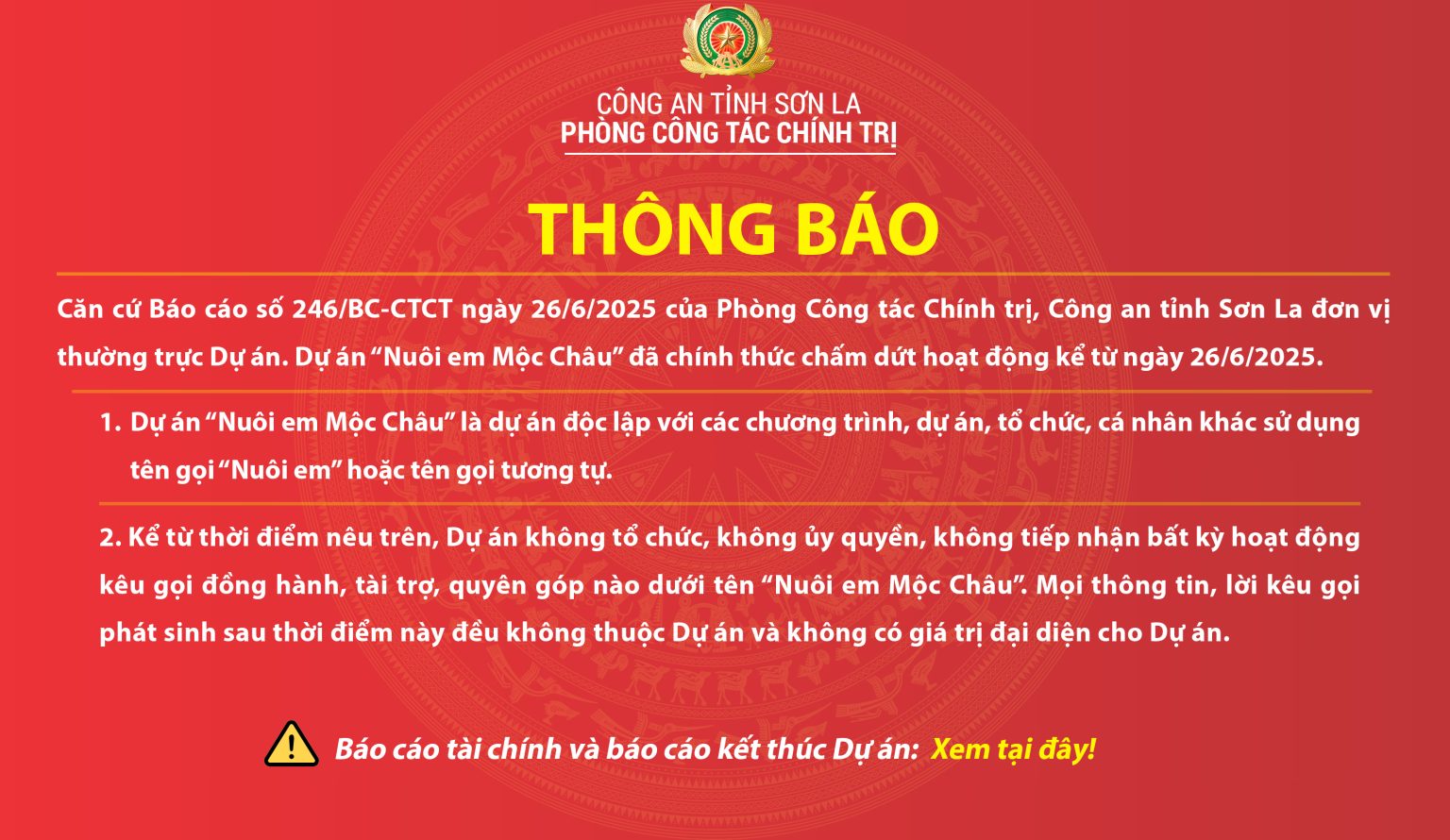 Dự án Nuôi em Mộc Châu nằm trong đề án “Tuổi trẻ Công an nhân dân tiếp bước em tới trường” của Ban thanh niên CAND và do Ban thanh niên Công an tỉnh Sơn La chủ trì, điều hành. Chủ nhiệm dự án là anh Dương Hải Anh – Ủy viên BCH Tỉnh đoàn, Trưởng Ban thanh niên Công an tỉnh Sơn La.