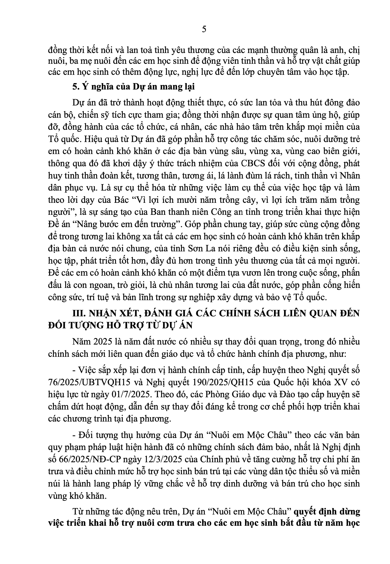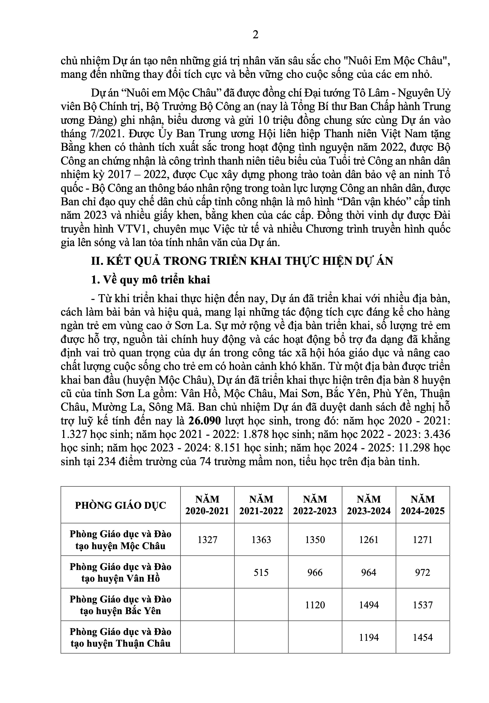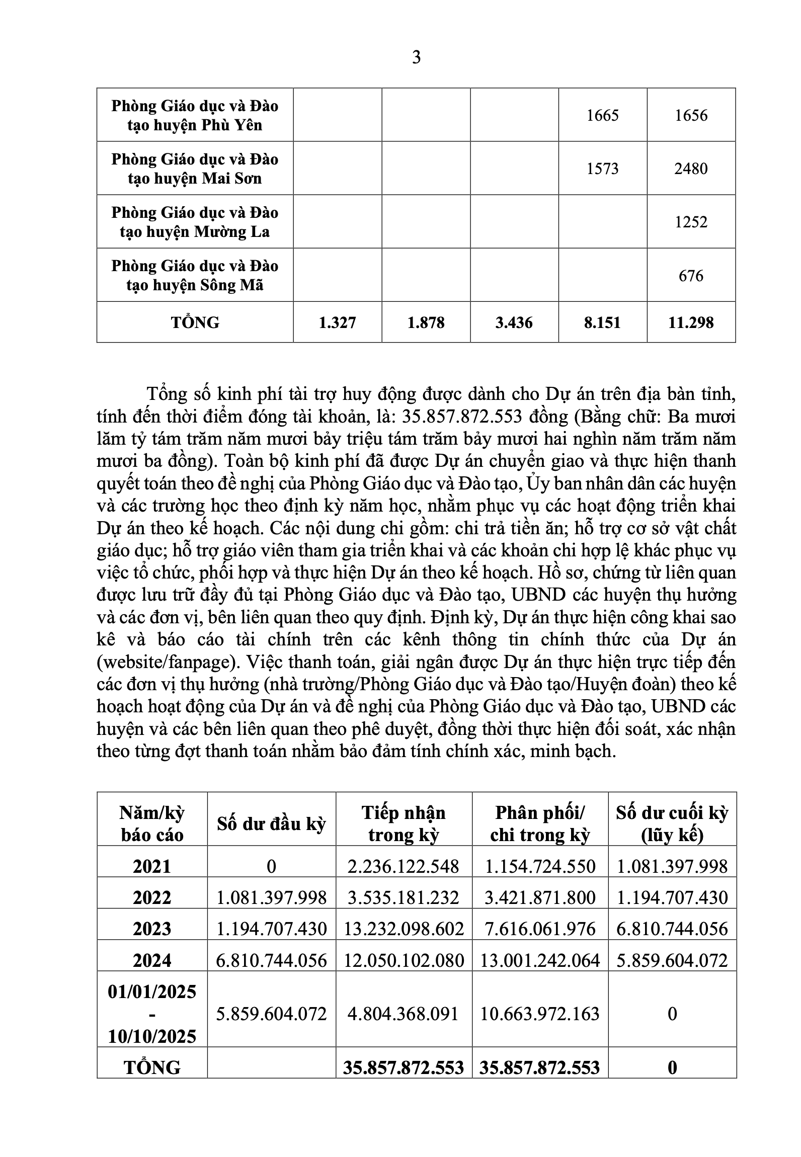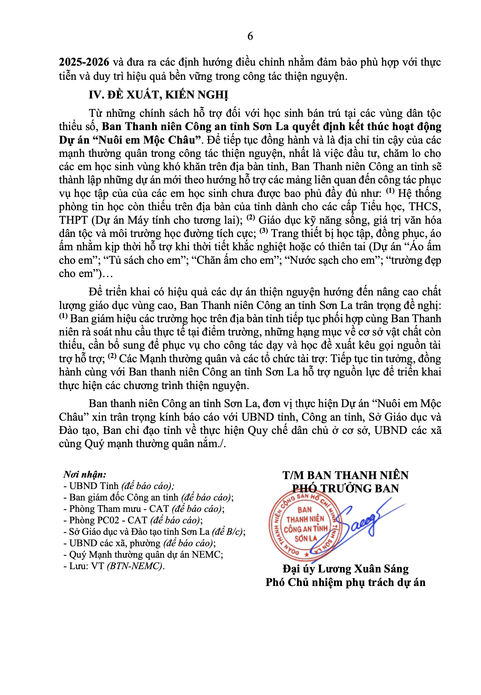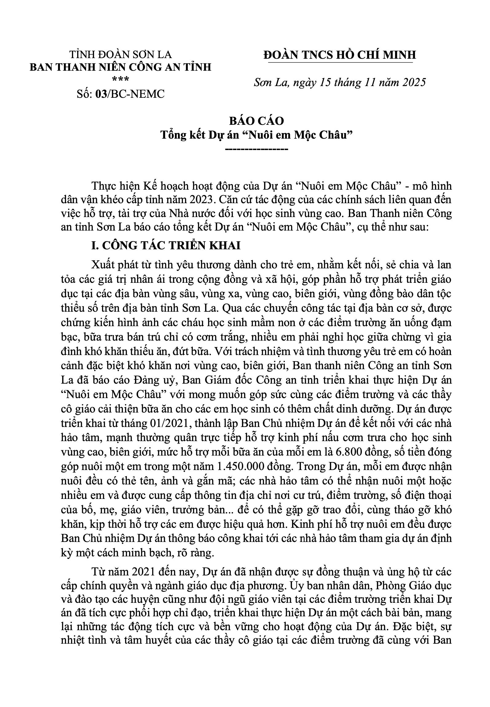 Ban thanh niên Công an tỉnh Sơn La xin trân trọng kính gửi tới Quý Mạnh thường quân báo cáo tổng kết số 03/BC-NEMC ngày 15 tháng 11 năm 2025 của dự án “Nuôi em Mộc Châu”. Sự quan tâm, đồng hành và sẻ chia đầy trách nhiệm của Quý Mạnh Thường Quân trong suốt thời gian qua đã góp phần quan trọng giúp dự án được triển khai hiệu quả, đúng mục tiêu và mang lại những giá trị nhân văn thiết thực cho giáo dục vùng cao. Một lần nữa Dự án Nuôi em Mộc Châu – Ban thanh niên Công an tỉnh Sơn La xin bày tỏ lòng tri ân sâu sắc trước sự tin tưởng và ủng hộ quý báu của Quý vị. Kính chúc Quý Mạnh Thường quân và gia đình luôn dồi dào sức khỏe, hạnh phúc và thành công.